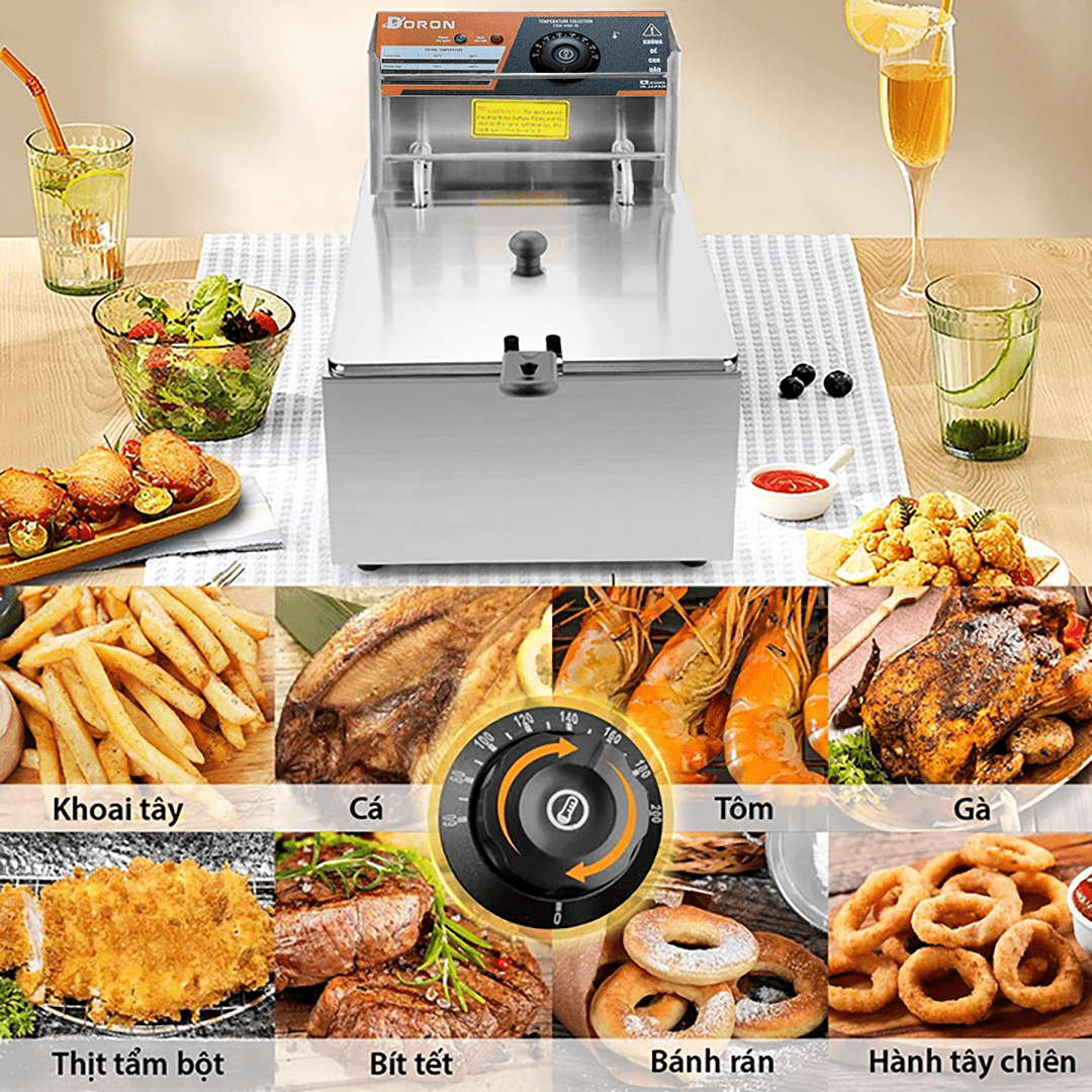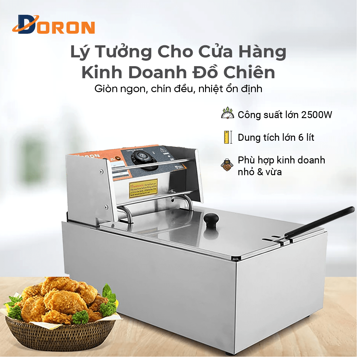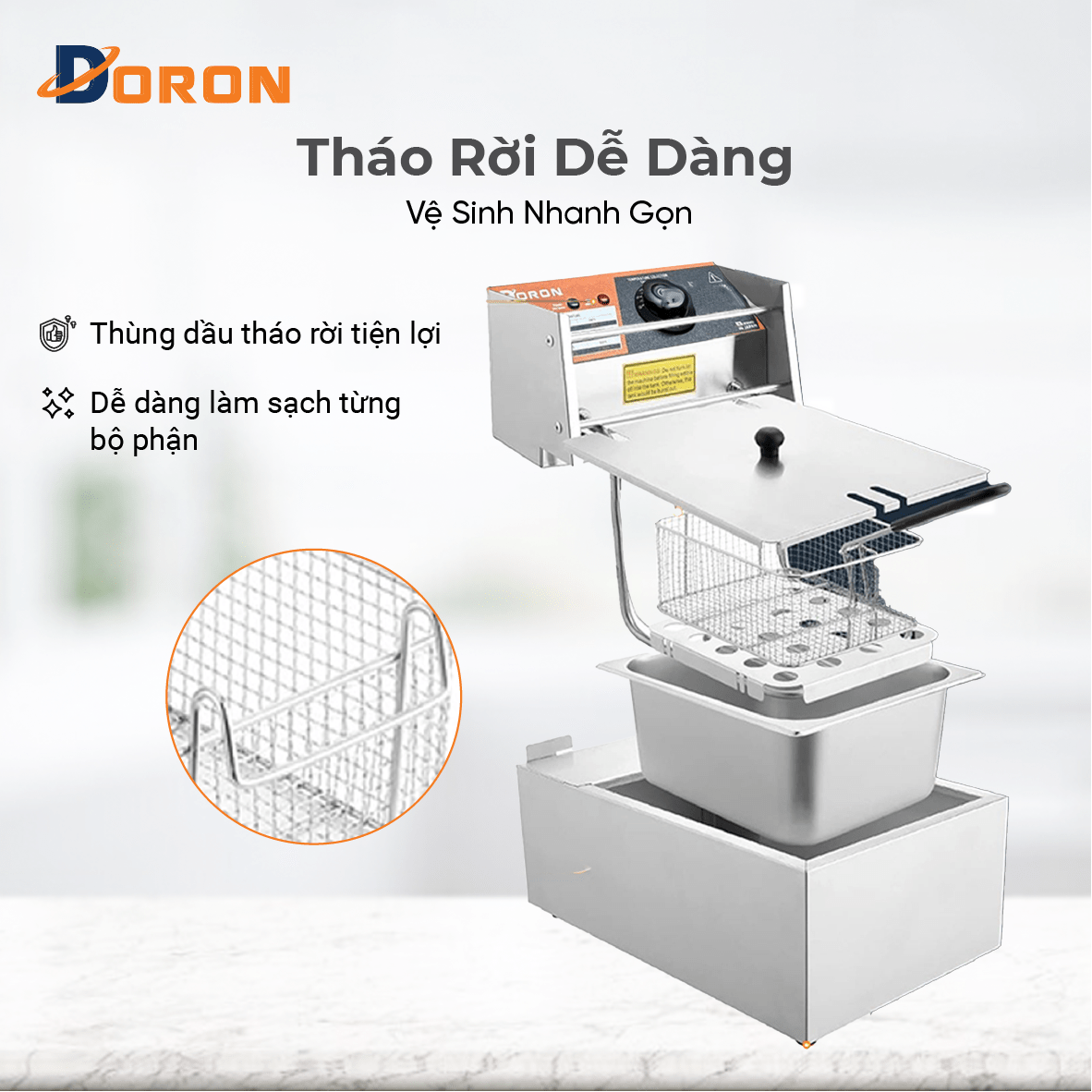 Bếp chiên DORON là bếp chiên dầu bằng điện có dung tích 6 lít. Bếp dùng dầu để chiên, rán thức ăn như gà, khoai tây, viên chiên, các đồ hải sản,… Bếp có kích thước nhỏ gọn, làm nóng nhanh, sạch sẽ là công cụ đắc lực cho các cửa hàng quán ăn chuyên nghiệp.