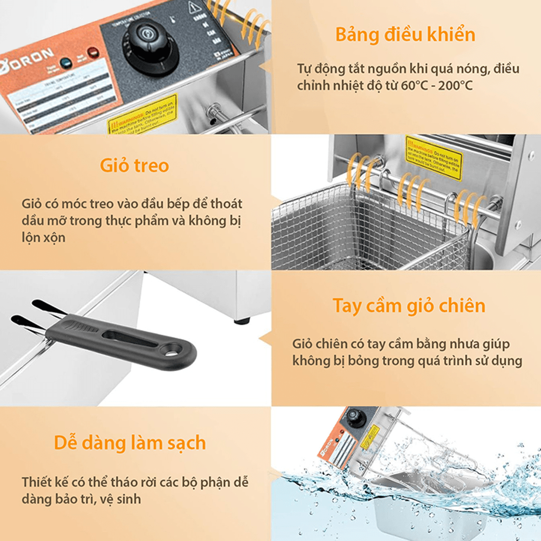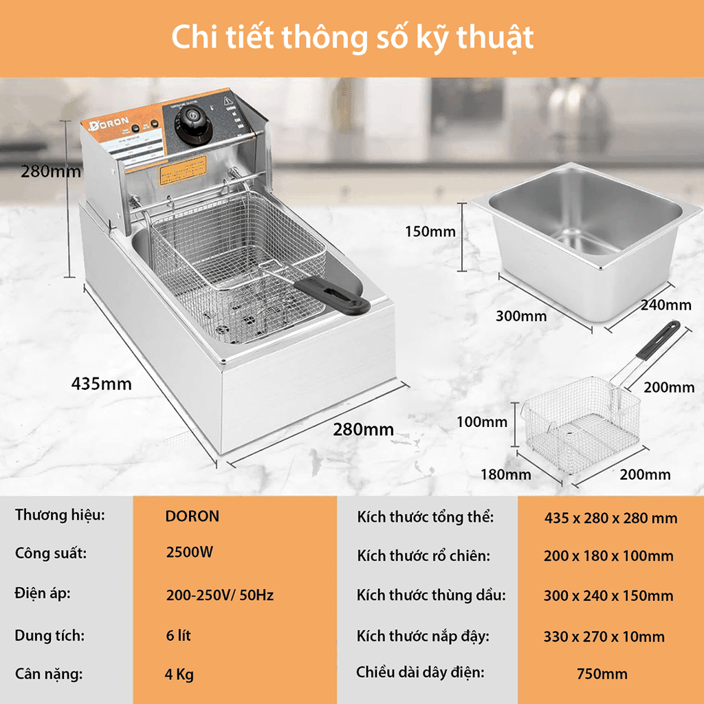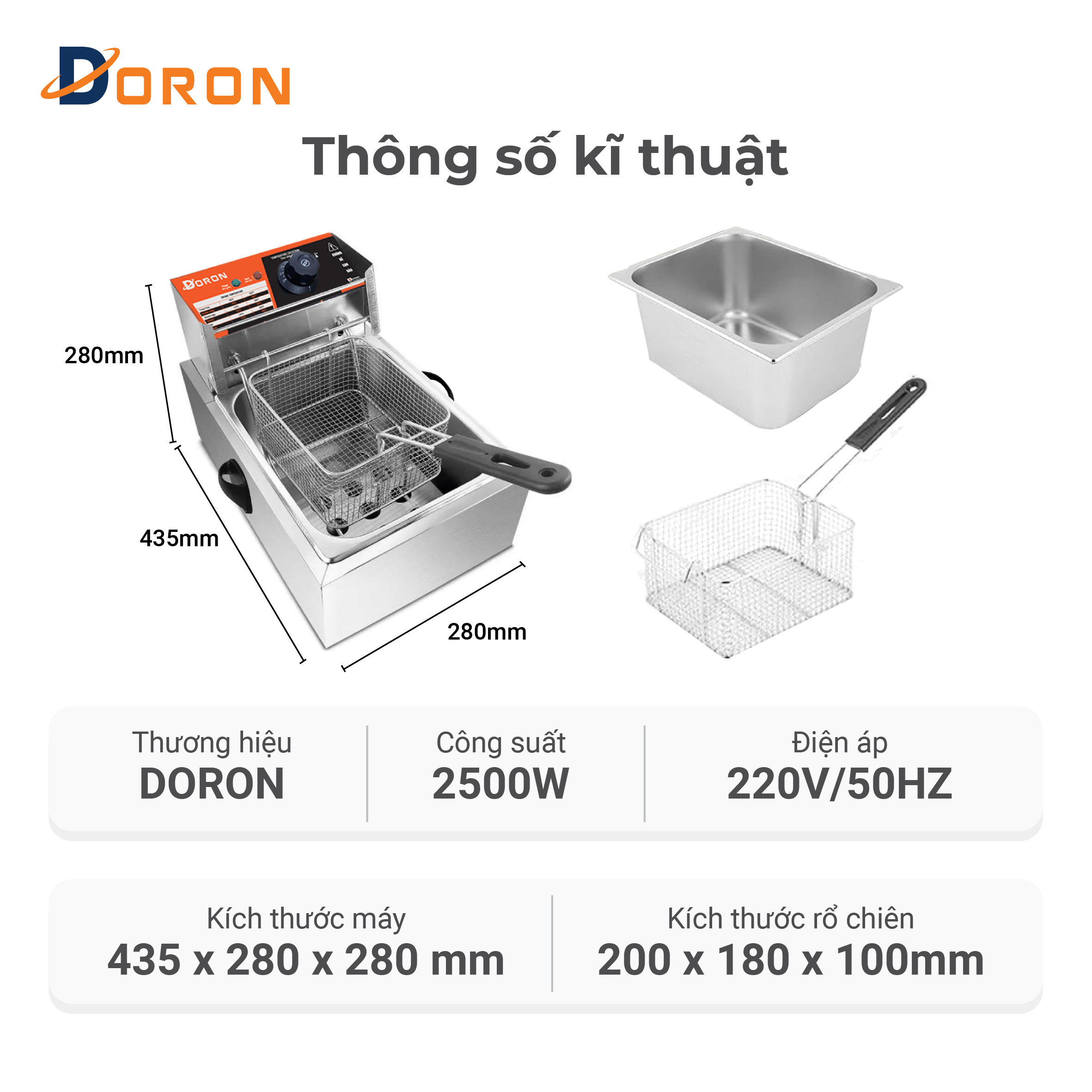Bếp chiên DORON là bếp chiên dầu bằng điện có dung tích 6 lít. Bếp dùng dầu để chiên, rán thức ăn như gà, khoai tây, viên chiên, các đồ hải sản,… Bếp có kích thước nhỏ gọn, làm nóng nhanh, sạch sẽ là công cụ đắc lực cho các cửa hàng quán ăn chuyên nghiệp.
