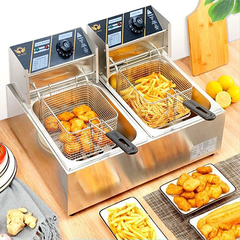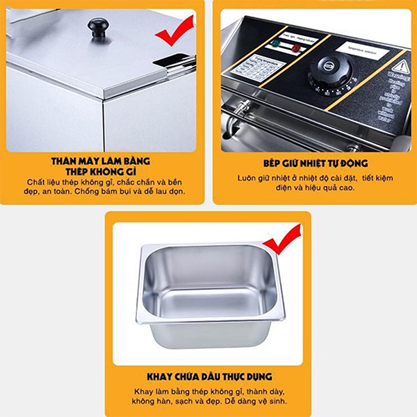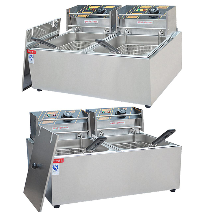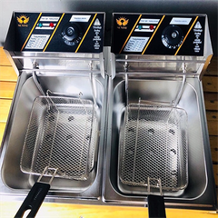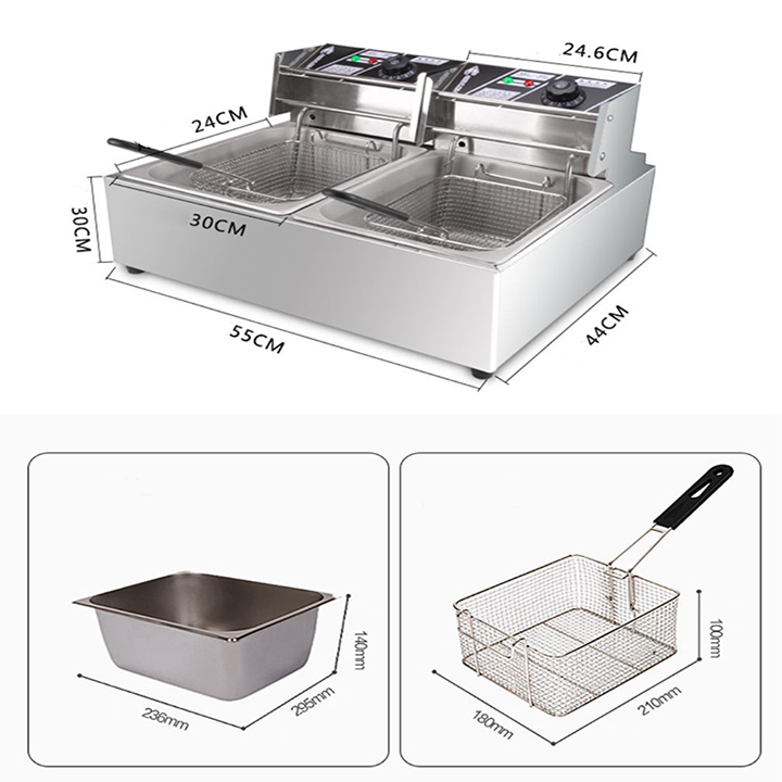 - Bếp chiên nhúng điện đôi 2 giỏ 6X2 lít: bếp chiên khoai tây, chiên gà, đùi gà, cánh gà, xúc xích, thịt bò... Bếp chiên đa năng thiết kế bằng inox không rỉ, có thể tháo rời dễ dàng thuận lợi cho vệ sinh.