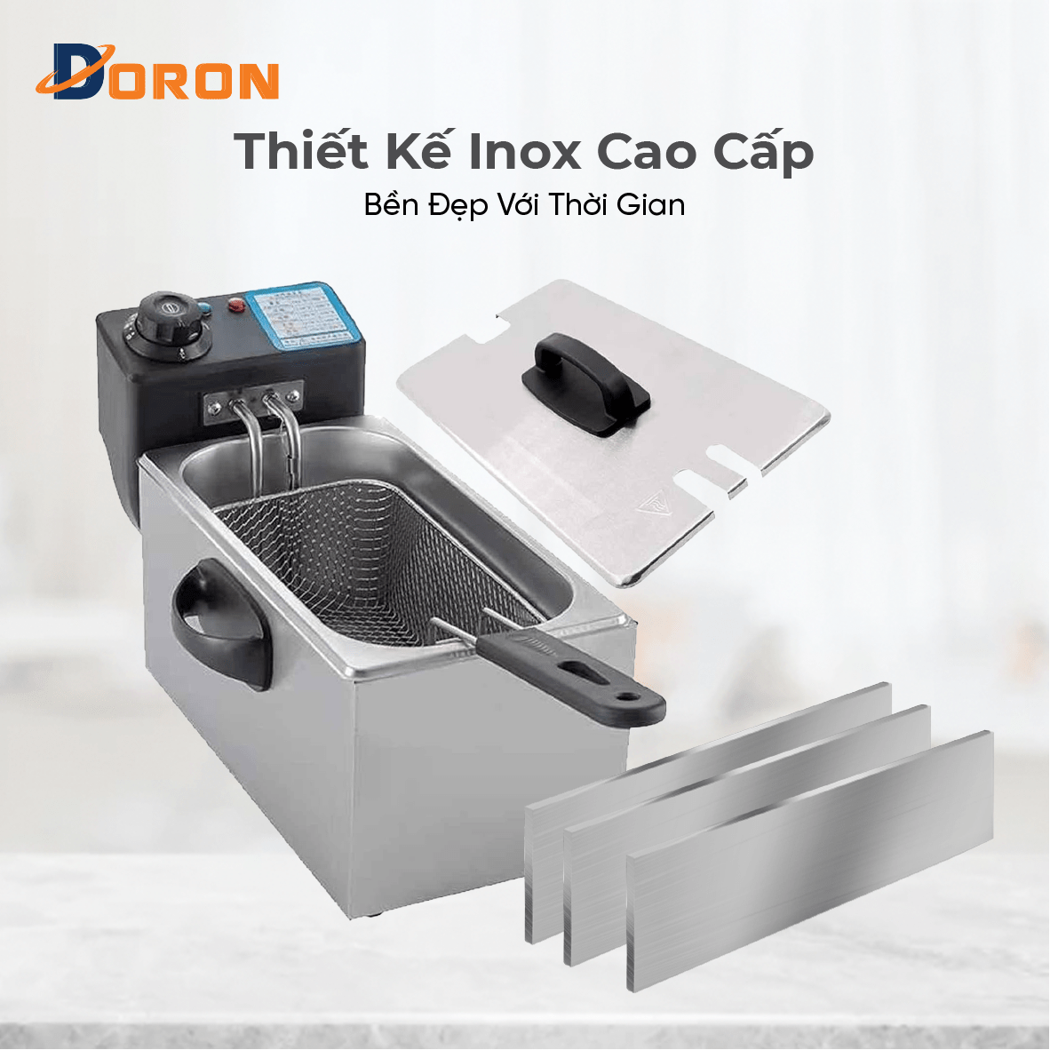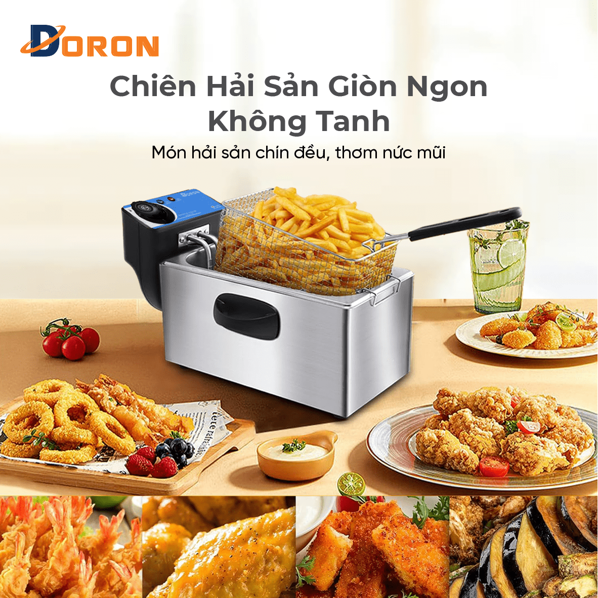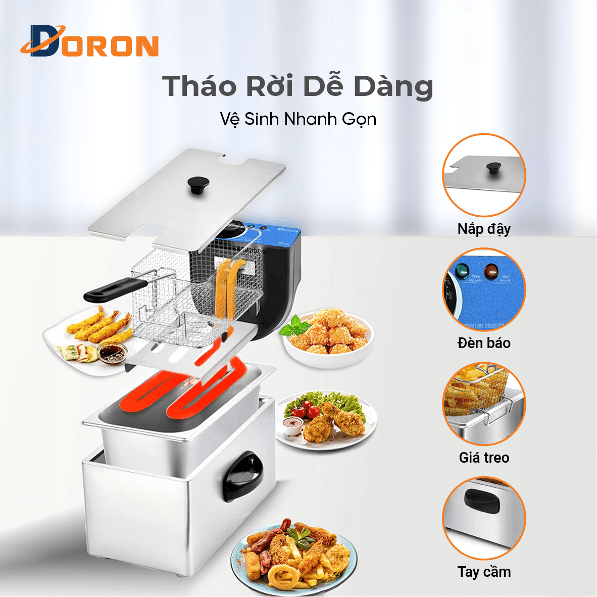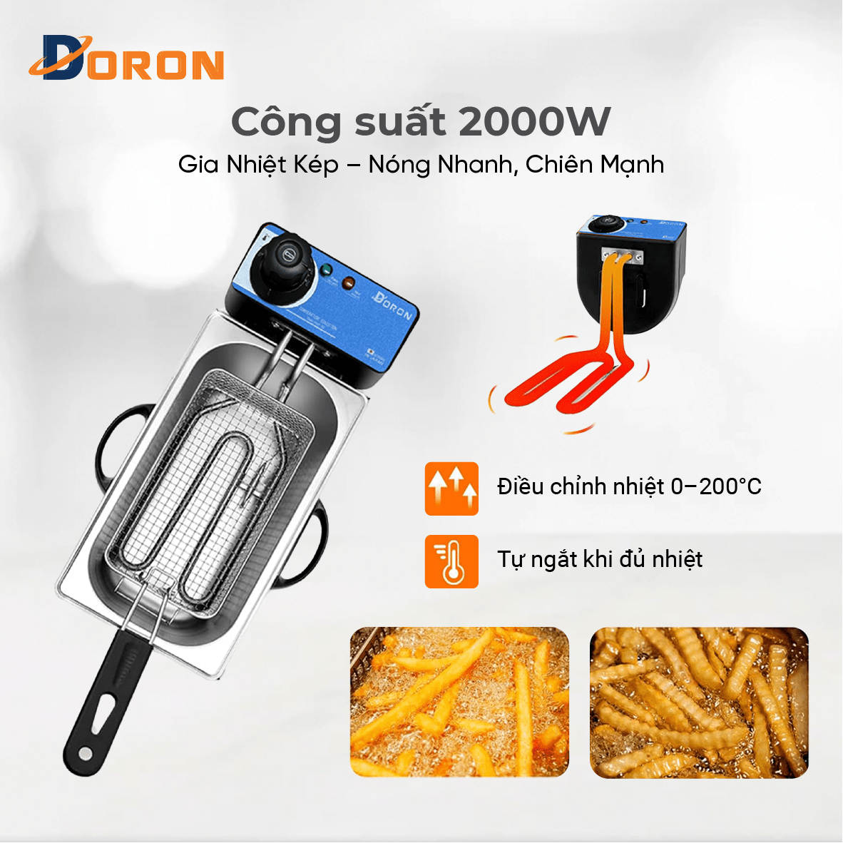 Bếp chiên nhúng 4L Doron là lựa chọn hoàn hảo cho quán ăn nhỏ, gia đình kinh doanh đồ chiên hoặc người yêu thích nấu nướng tại nhà. Với dung tích 4 lít vừa phải, máy đáp ứng nhu cầu chiên khoai tây, gà rán, nem, hải sản… nhanh chóng và tiết kiệm dầu.