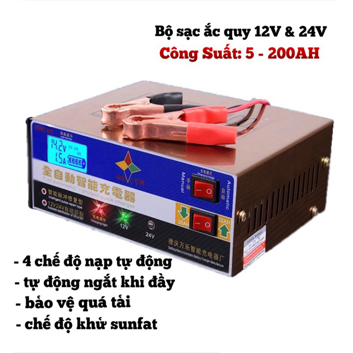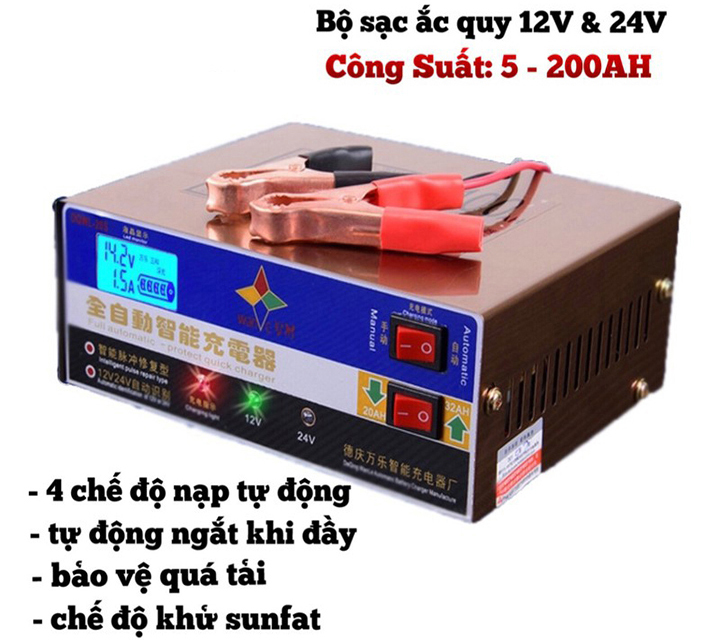 - Đặc biệt có tính năng thông minh AI do IC điều khiển quá trính sạc 4 chu kỳ : Phục hồi, sạc nhẹ, sạc bình thường và nhồi nhanh. Bộ sạc phù hợp sạc các loại bình ắc quy khô, nước, và khí dung tích từ 12V/24V từ 3.5AH - 200ah.