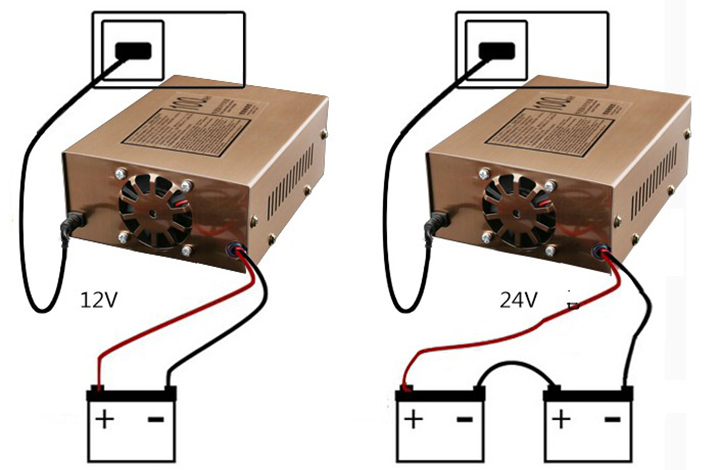 - Cắm điện lưới 220v trước rồi câu kẹp đỏ vào + và kẹp dây sạc đen vào - của bình ắc quy, đèn trên bộ sạc sẽ sáng 12v (nếu là bình 12v), hoặc 24v (nếu là bình 24v).