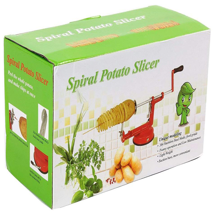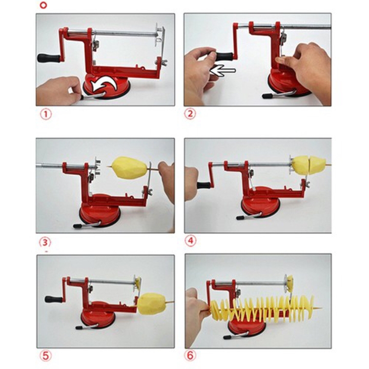 - Máy khoai tây lốc xoáy có thiết kế bám sát vào mặt bàn giúp cho quá trình thái diễn ra dễ dàng hơn. Quy trình tháo lắp mát diến ra vô cùng đơn giản. Từ việc lắp chốt đế máy đến lắp khoai tây vào máy, lưỡi dao sắc bén giúp máy thái một cách dễ dàng.
