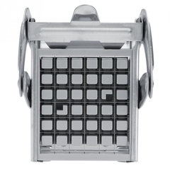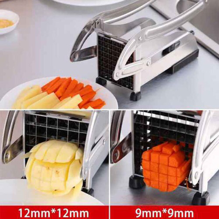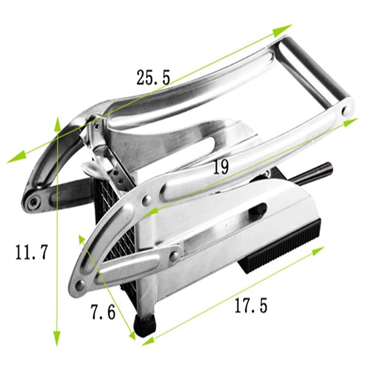 - Sản phẩm máy cắt khoai tây được thiết kế cực kỳ thông minh, với khay ép chuyển động dọc theo chiều cắt nên dễ dàng cắt các củ quả thành miếng hình vuông dài.