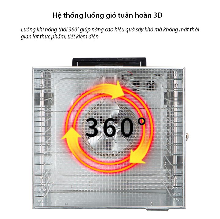 ⭐ Khoang máy kín với ống dẫn khí được gắn phía sau cho phép gió và nhiệt tạo thành luồng khí nóng. Không khí nóng được lưu thông 360 tuần hoàn nên thực phẩm sẽ được sấy khô một cách đồng đều.