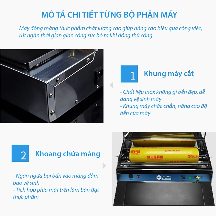 ⭐ Máy sử dụng được với nhiều loại màng bọc với độ dày, mỏng khác nhau. Có 1 lưỡi cắt để cắt màng sau khi bọc xong sản phẩm.