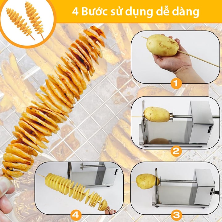 Máy cắt khoai tây lốc xoáy có cấu tạo đơn giản, vận hành dễ dàng chỉ cần cho khoai tây vào đầu lưỡi dao và quay chưa đầy 1 phút bạn đã có 1 sản phẩm đẹp và ngon.