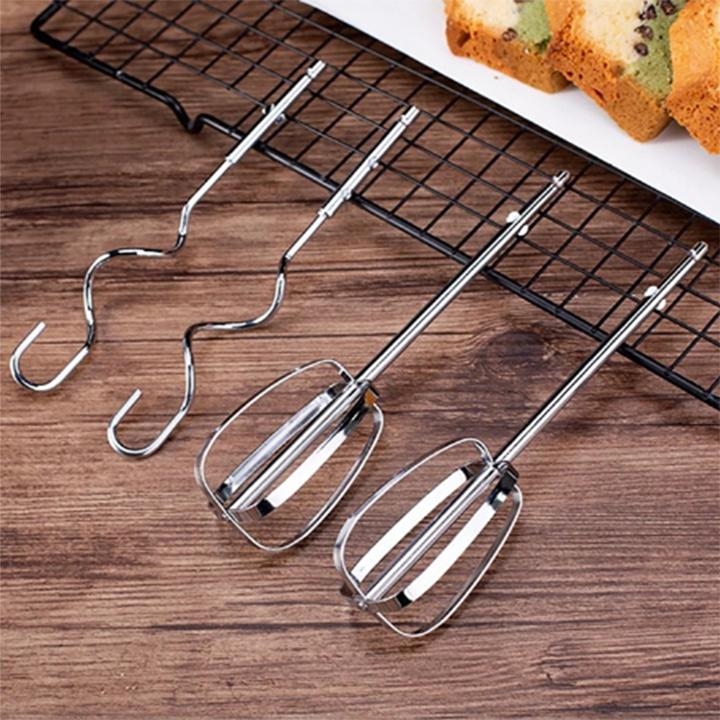 - Que đánh trứng được thiết kế dạng lồng giúp đánh trứng, kem, bơ mềm... hiệu quả hơn. Que có thiết kế dạng xoắn dùng để trộn, nhào bột. Que trộn bột, đánh trứng làm bằng thép không gỉ an toàn cho sức khỏe, có thể tháo lắp dễ dàng.