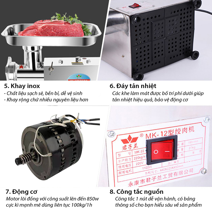 Máy xay thực phẩm MK-12. Với công suất xay mạnh mẽ, máy sẽ giúp tiết kiệm cả sức lực lẫn thời gian. Máy phổ biến trong các sạp thịt ở chợ , máy hoạt động êm không bị rung a dạng hạt để làm xúc xích, lạp xưởng, nem chua, mọc, pate… hay để làm các món ăn hấp dẫn: bò viên, thịt sốt viên, canh thịt xay