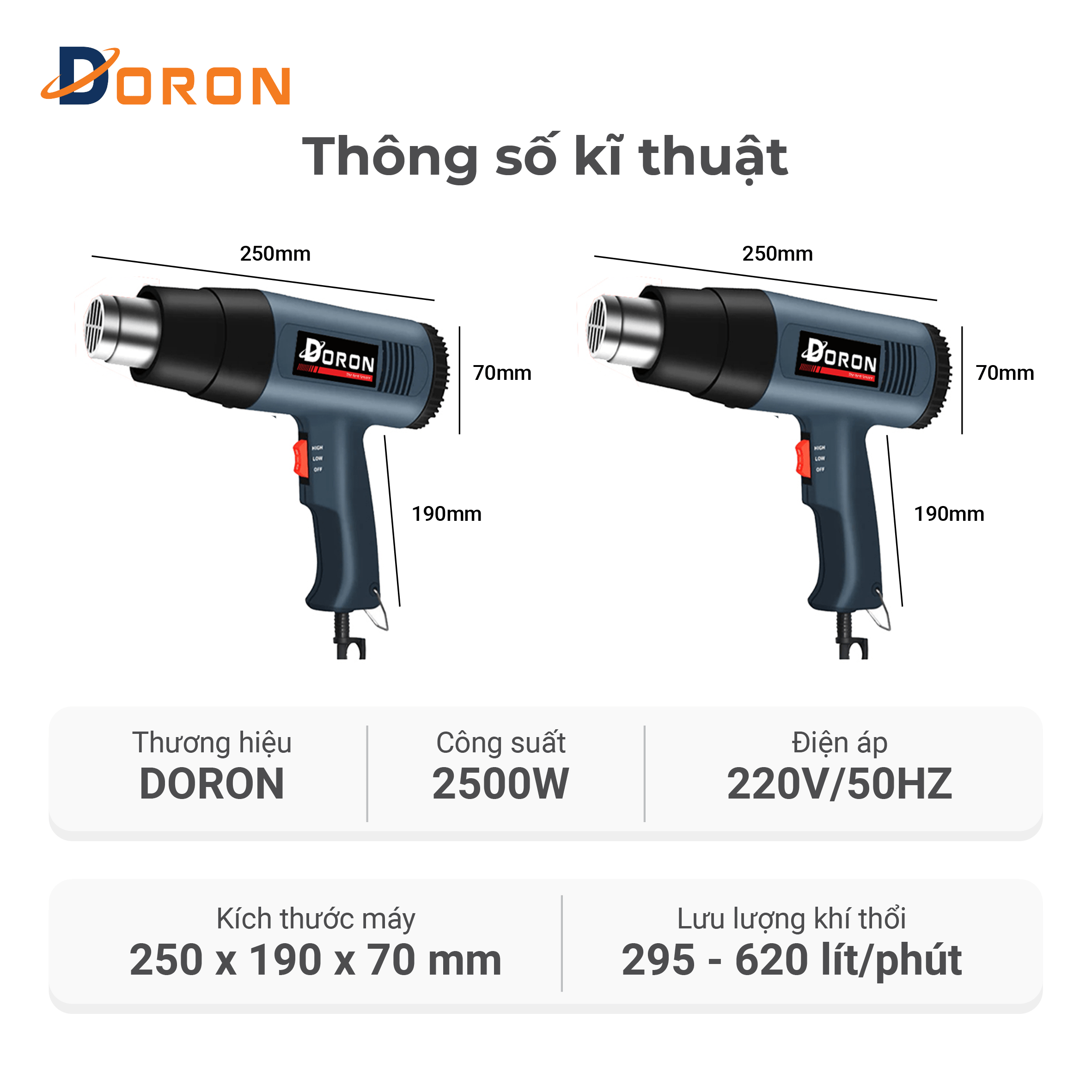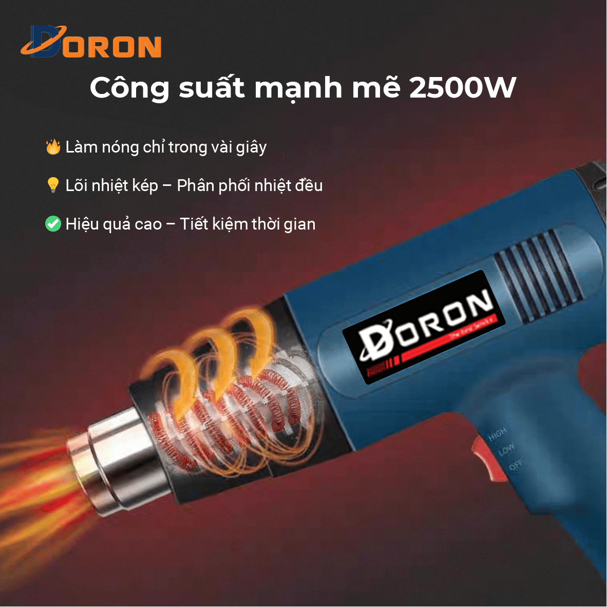 Máy khò nhiệt Doron 2500W được sản xuất theo công nghệ hiện đại, có độ chuẩn xác cao, đảm bảo mang đến hiệu quả công việc tối ưu và thời gian sử dụng lâu dài