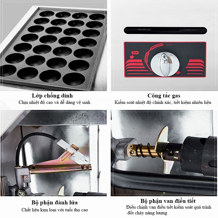 💥 Bộ điều khiển nhiệt có công tắc bật tắt điều khiển độ lớn của ngọn lửa và do đó kiểm soát được nhiệt độ chiên nướng của khuôn.
