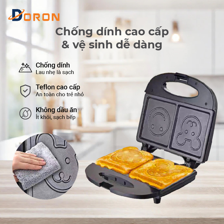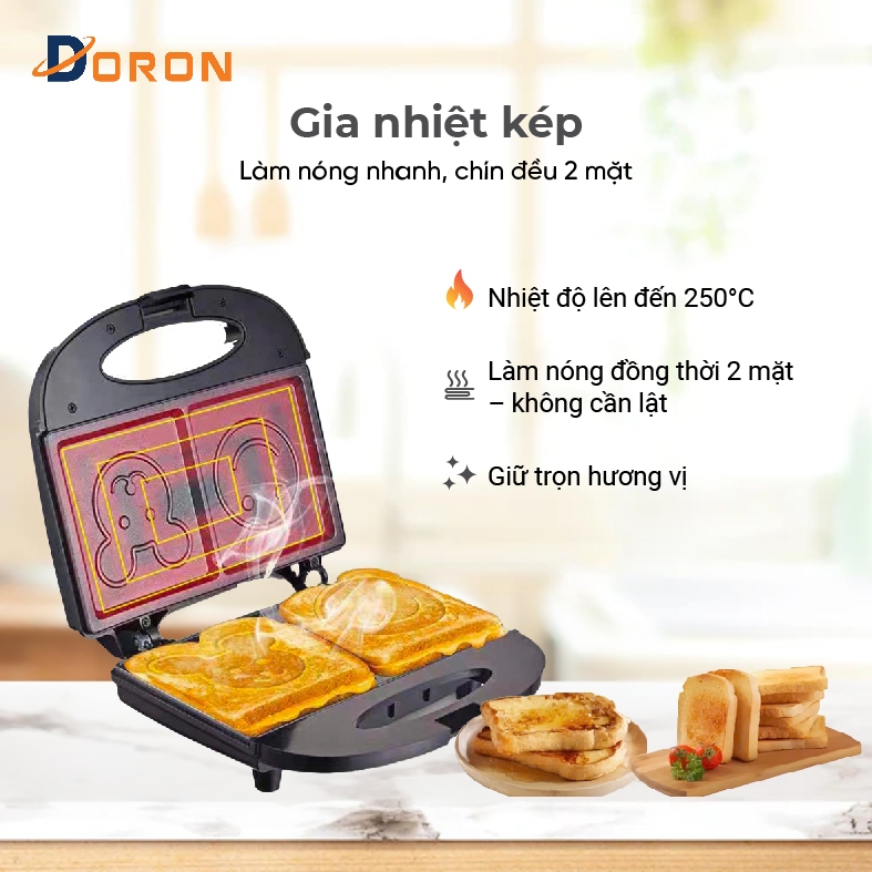 - Nếu bạn là người yêu thích những chiếc bánh sandwich nóng hổi, vàng giòn mỗi sáng mà không tốn quá nhiều thời gian hay công sức, Máy nướng bánh mì DORON chính là lựa chọn hoàn hảo dành cho bạn và gia đình. Với thiết kế hiện đại, tính năng thông minh cùng kiểu dáng nhỏ gọn, máy nướng bánh DORON mang đến trải nghiệm làm bánh tiện lợi, an toàn và đầy thú vị.
