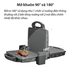 ⭐ Khi mở ra 180 độ bạn có thể sử dụng như 1 chiếc vỉ nướng điện thông thường với 2 bên khay nướng với 2 nút điều chỉnh nhiệt độ khác nhau.Bạn có thể sử dụng như 1 chiếc máy nướng bánh Sandwich, hoặc nướng cá thịt.