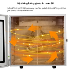⭐ Khoang máy kín với ống dẫn khí được gắn phía sau cho phép gió và nhiệt tạo thành luồng khí nóng. Không khí nóng được lưu thông 360 tuần hoàn nên thực phẩm sẽ được sấy khô một cách đồng đều.