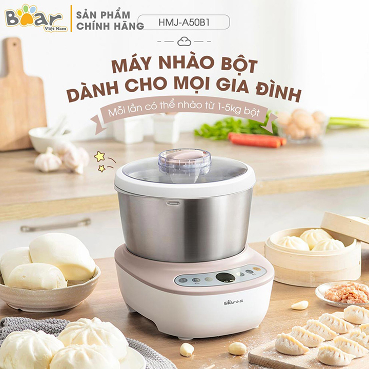 - Máy trộn bột Bear có thể nhào trộn và ủ bột giúp làm ra các món ăn ngon tuyệt như bánh bao, bánh mì hoa cúc, bánh mì ngọt,... vô cùng thơm ngon, thớ bánh đều. mịn mượt.