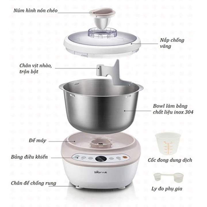 - Công suất ổn định với đáy chống rung và nắp chốt kín giúp chống bắn, trào bột, nước đồng thời sẽ ủ bột nhanh hơn.