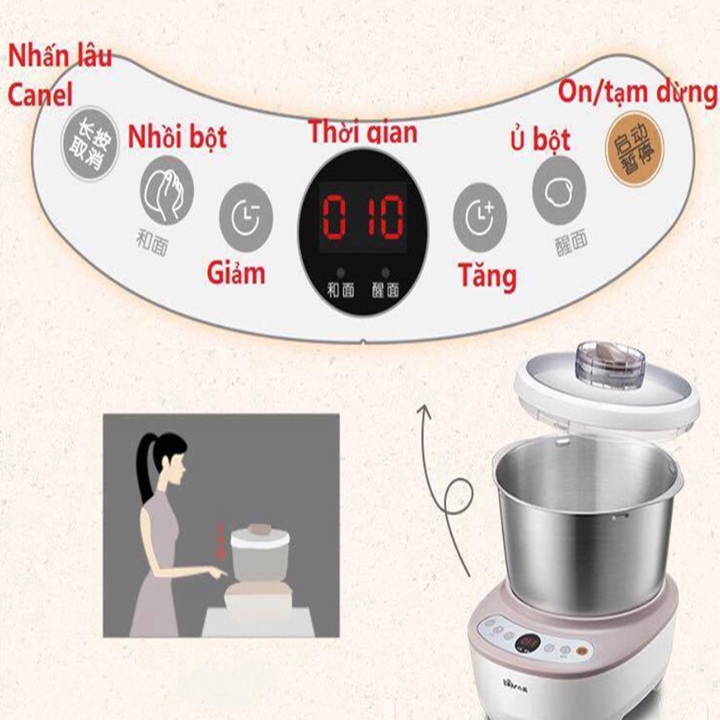 - Chức năng hẹn giờ với các nấc thời gian ủ và nhào bột thuận tiện. Người dùng có thể tự do chọn lựa chế độ và thời gian theo yêu của mỗi loại bánh.